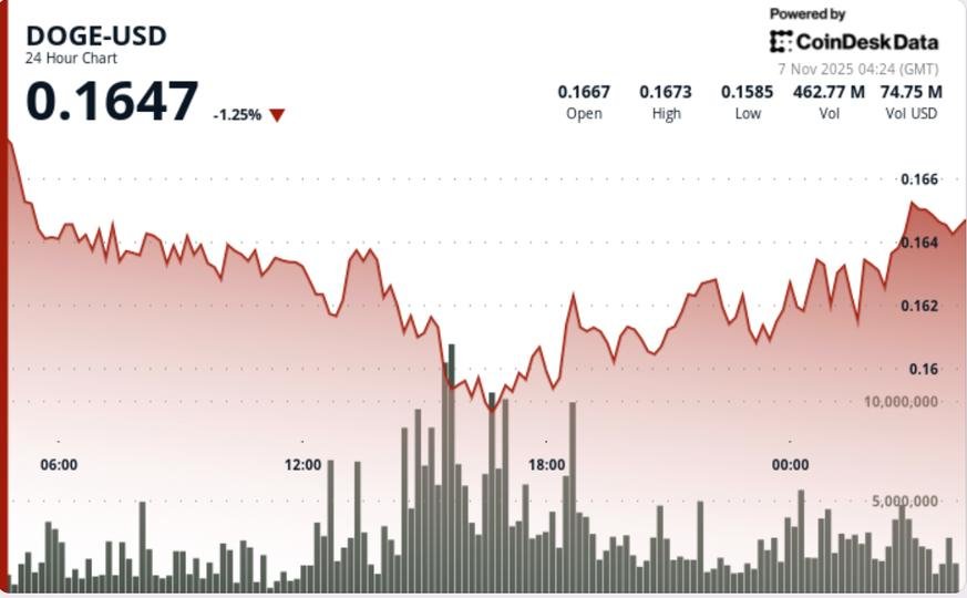DOGE cayó un 2,4% a 0,1634 dólares durante la sesión de 24 horas, rompiendo por debajo del soporte de 0,167 dólares en medio de ventas masivas aceleradas. El token cotizó a través de un rango intradiario del 6,4%, estableciendo máximos más bajos secuenciales durante las primeras 16 horas de negociación.