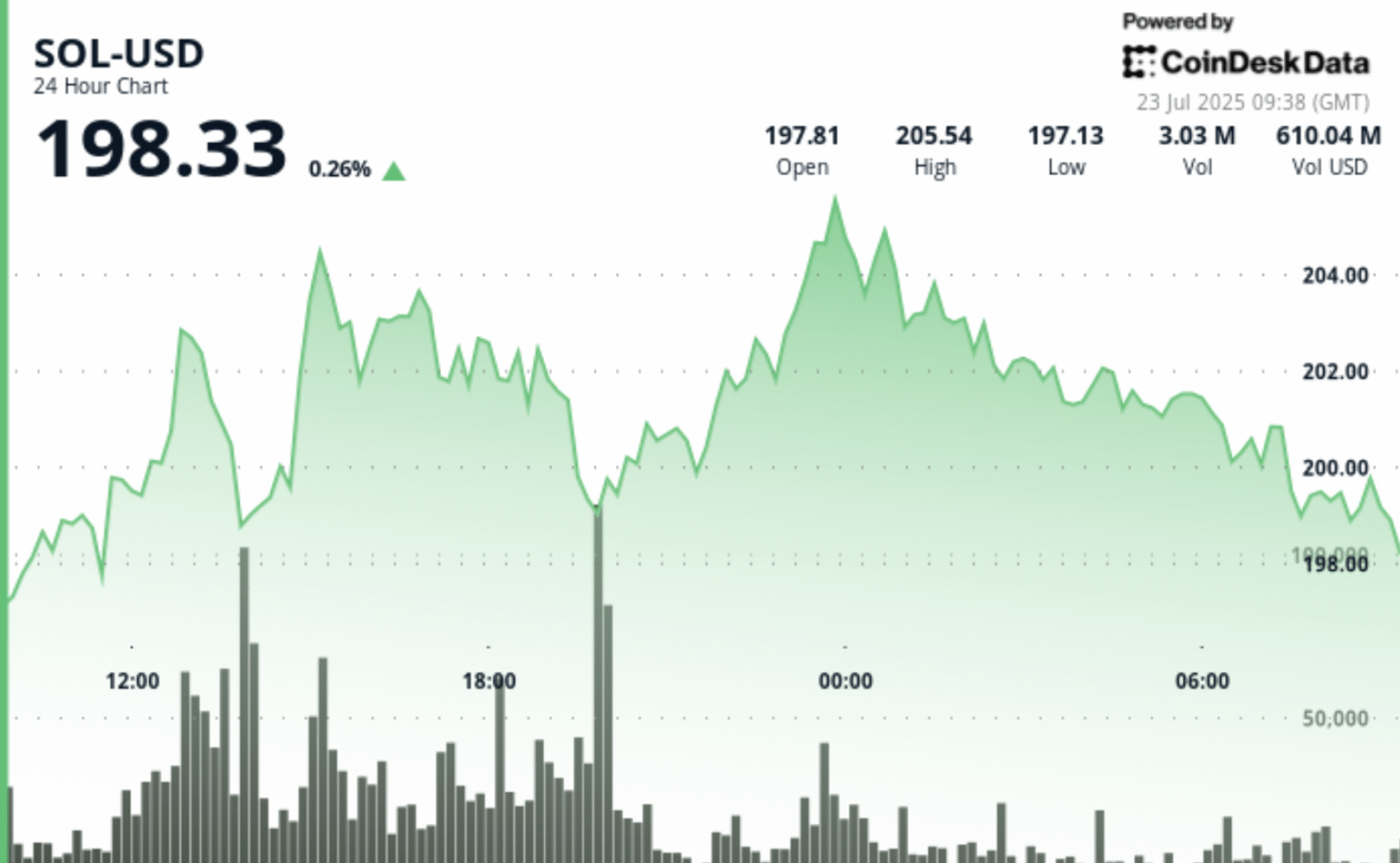 Al momento de escribir este artículo, Sol se cotiza a $ 198.33, un 0.26% más en las últimas 24 horas, según los datos de CoinDesk. El token se ha recuperado un 20% durante la semana pasada, un 30% en las últimas dos semanas y un 47.6% en el último mes, lo que lo convierte en uno de los activos principales de mejor rendimiento en el mercado de criptografía este trimestre.